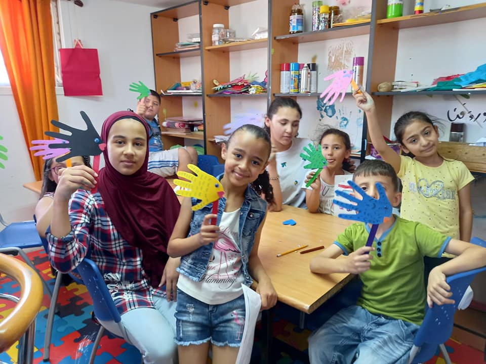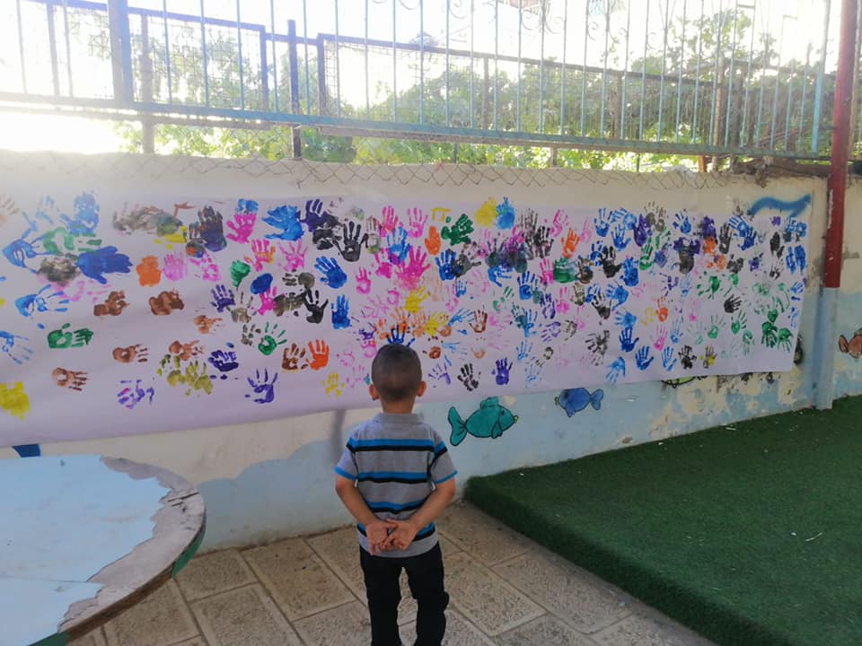 At the children center Nahda Charitable Society of Abu Dis, children have been doing wall painting with their hands and paper cutting into multiple shapes. Needless to say the kids were really enjoying this!