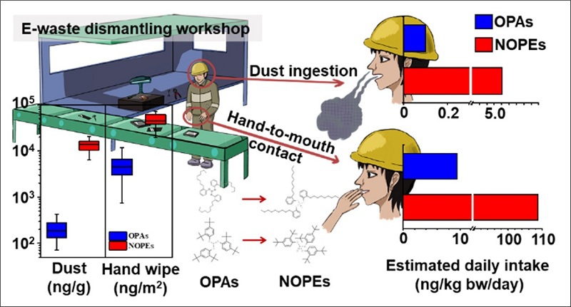Occurrence of novel organophosphate esters derived from organophosphite antioxidants in an e-waste dismantling area: Associations between hand wipes and dust. Environment International2021, 157, 106860.