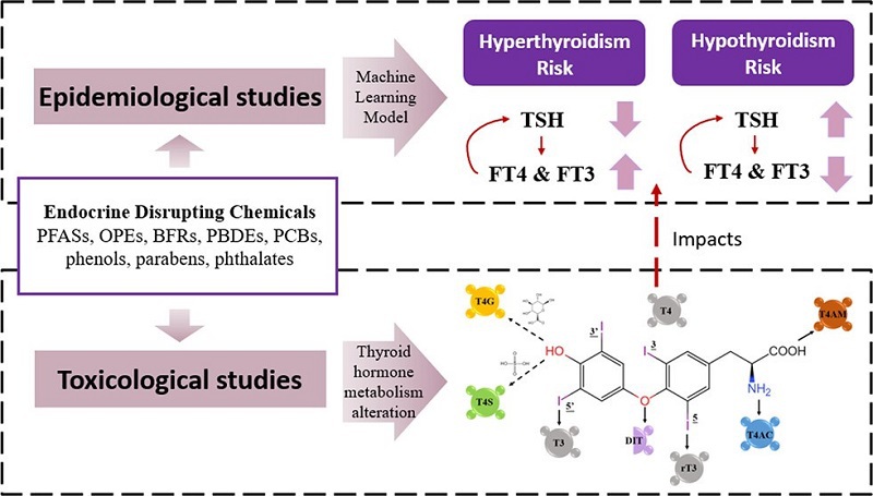 结合机器学习方法,分析内分泌干扰物对甲状腺激素水平影响的流行病学调查数据,并将分析结果与目前的毒理学研究相结合,从两个角度说明内分泌干扰物的潜在甲状腺功能干扰风险。